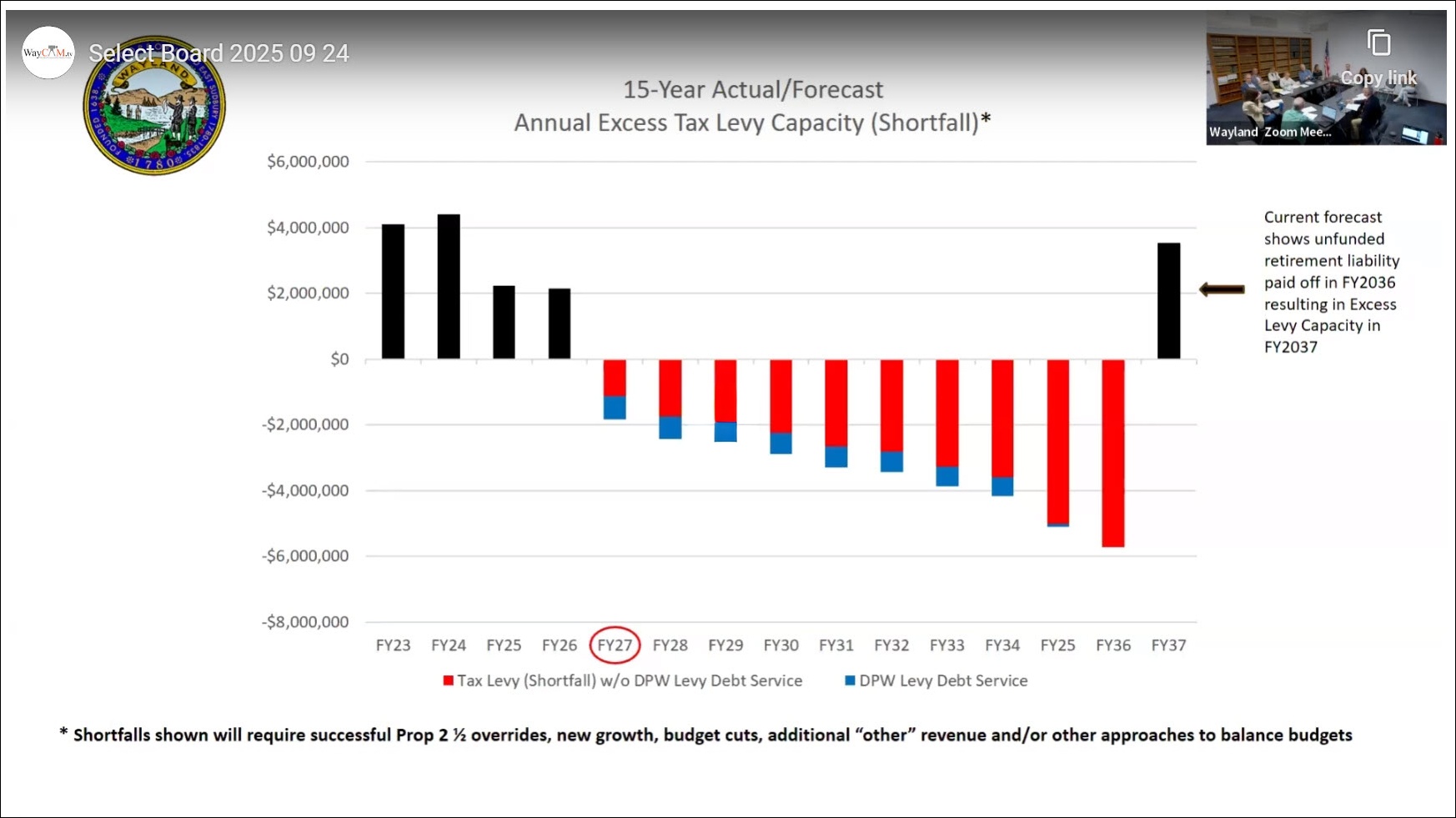 At the September 15 Select Board meeting, Finance Director Brian Keveny warned that Wayland’s fiscal problem is no longer cyclical. The town is sliding into what he called a structural deficit — a recurring mismatch between what the town can legally raise under Proposition 2½ and what it must spend on wages, benefits, pensions, insurance, and schools. “We can balance FY27, but the structural deficit doesn’t go away,” Keveny said. “It comes back year after year, because the underlying cost drivers are fixed and increasing.” His 15-year financial forecast showed shortfalls almost every year from FY2027 until FY2036, when pension