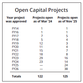 The summary table shows the significant progress made in close outs since the first list of open capital projects was assembled in March 2024 by the Town Manager’s office. The list tracks completed but not off the books projects as well as ongoing projects with appropriated funds not started or put on pause. With each Annual Town Meeting, newly approved projects are added to the open capital list. Thirty eight new projects were added in FY26 to the 87 open projects before 2025 ATM. 125 projects remain in progress as of Dec. 1.