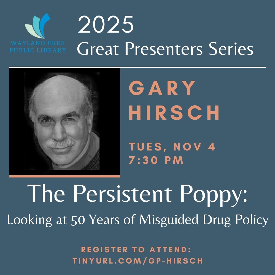 Nov 4 7:30 pm - 8:45 pm Great Presenters: The Persistent Poppy: Looking at 50 Years of Misguided Drug Policy Wayland Free Public Library 5 Concord Road Event Details Get Directions