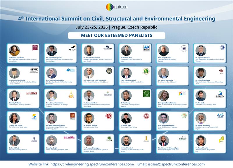 Spectrum Conferences cordially invites you to its 4th International Summit on Civil, Structural and Environmental Engineering (ISCSEE2026), which is going to be held in Prague, Czech Republic during July 23-25, 2026. Civil Engineering, Structural Engineering, Environmental Engineering, Geotechnical Engineering, Transportation Engineering, Construction Engineering, Water Resources Engineering, Hydraulic Engineering, Earthquake Engineering, Coastal Engineering, Offshore Engineering, Urban Engineering, Municipal Engineering, Tunnel Engineering, Marine Engineering, Railway Engineering, Highway Engineering, Pavement Engineering, Airport Engineering, Dam Engineering, Reinforced Concrete Structures, Steel Structures, Pre-stressed Concrete, Composite Structures, Structural Design, Structural Analysis, Tall Buildings, Load-Bearing Structures, Building Design Codes, Structural Rehabilitation, Structural Reliability, Wind Engineering, Soil Mechanics,