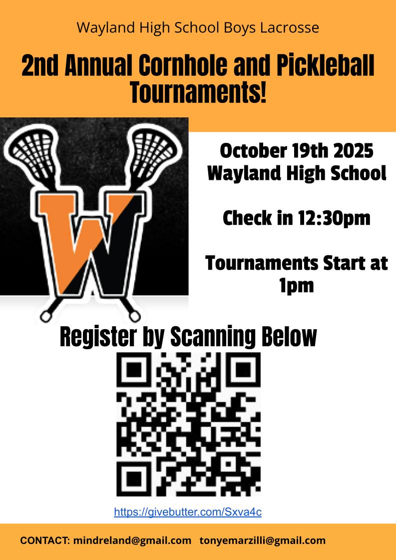 Oct 19 12:30 pm - 4:00 pm Wayland High School Boys Lacrosse Fundraiser Wayland High School 264 Old Connecticut Path Event Details Get Directions