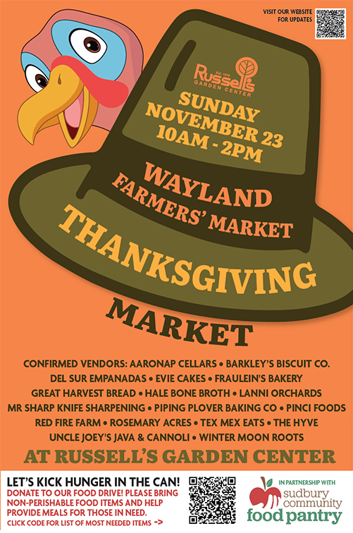 Wayland Farmers’ Market: Thanksgiving Market At Russell’s Garden Center Nov 23 10:00 am - 2:00 pm Wayland Farmers’ Market: Thanksgiving Market At Russell’s Garden Center