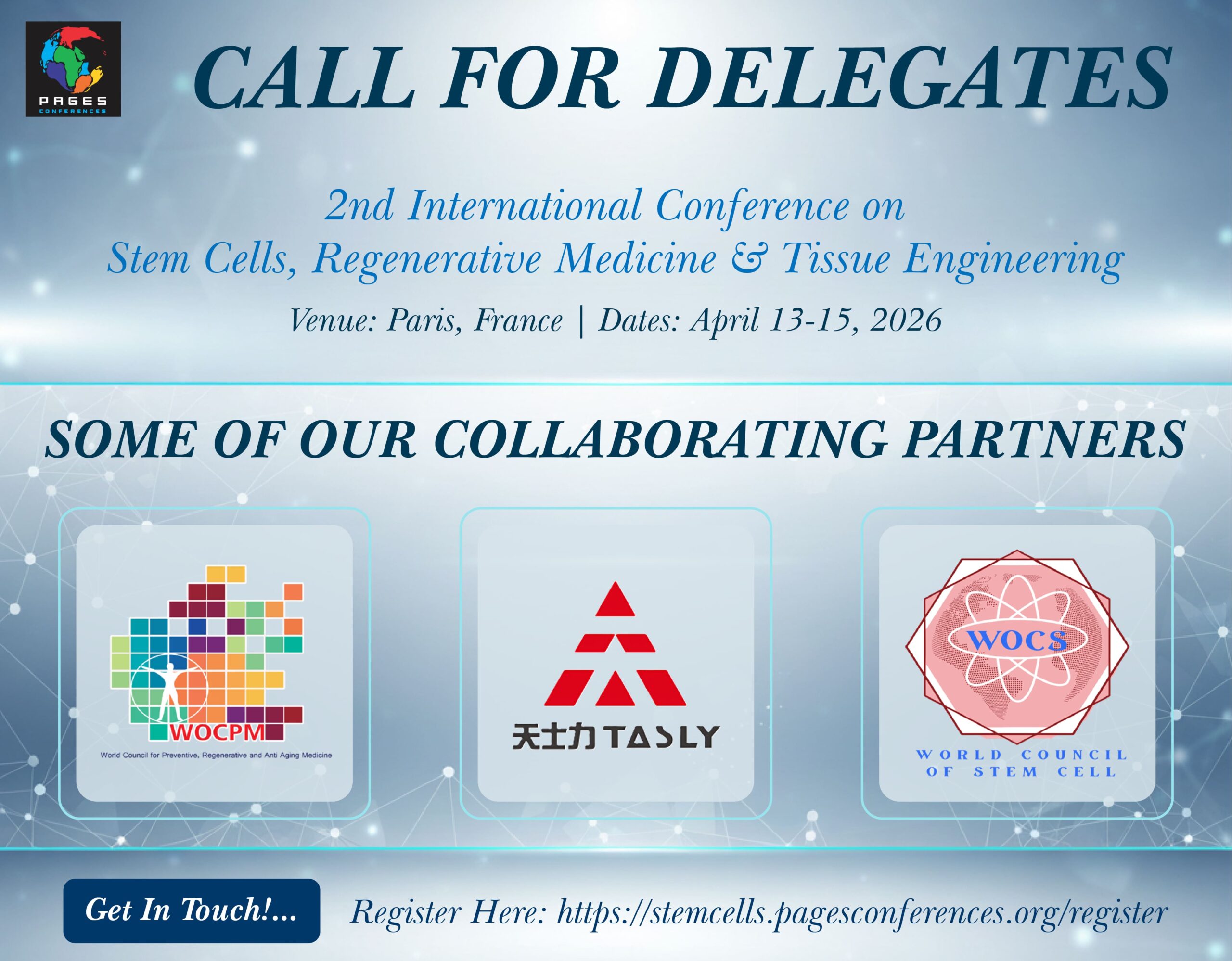 2nd International Conference on Stem Cells, Regenerative Medicine & Tissue Engineering Apr 13 2nd International Conference on Stem Cells, Regenerative Medicine & Tissue Engineering April 13 @ 9:30 am - April 15 @ 6:30 pm $849