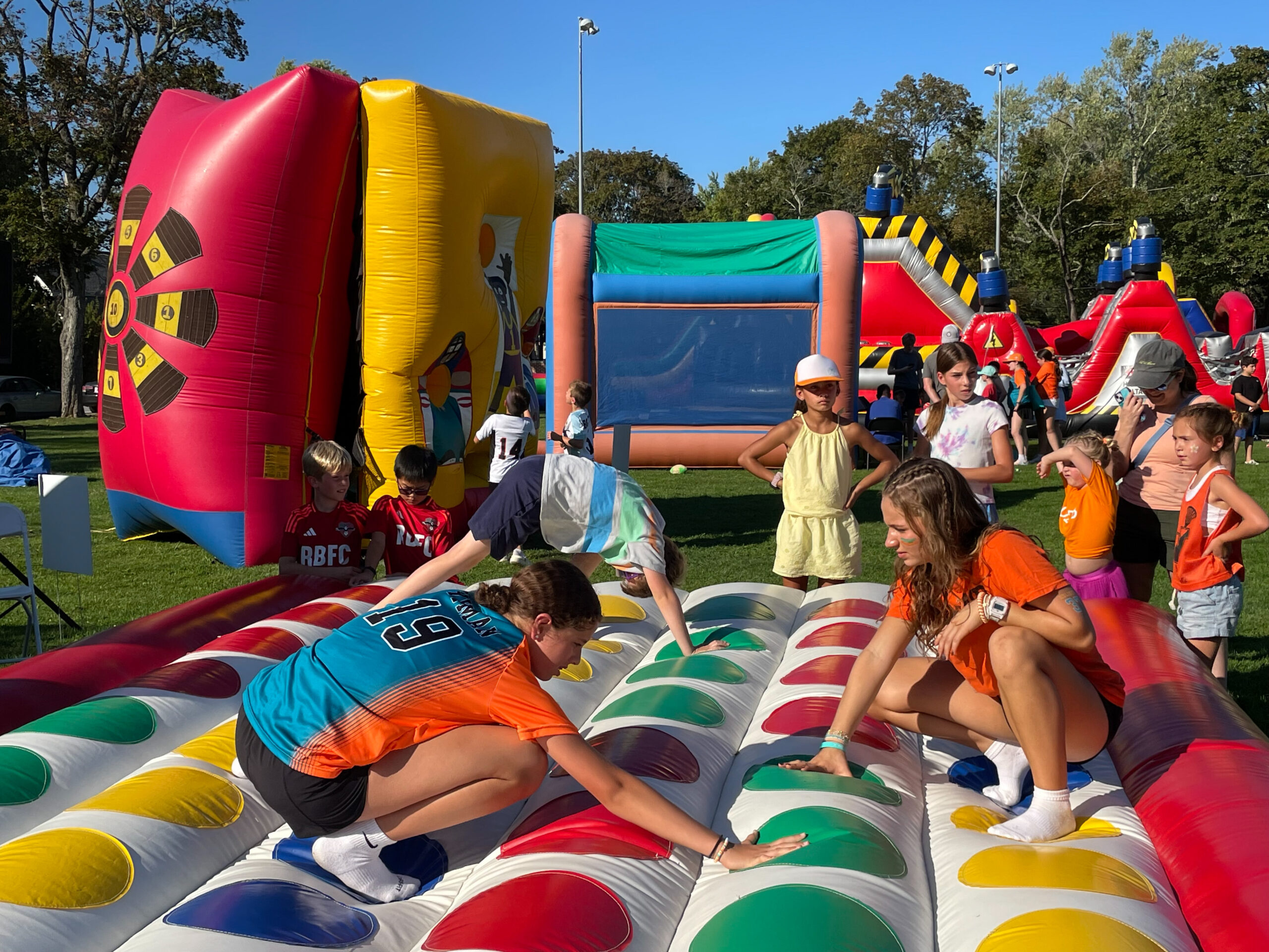 Children bounced between inflatable obstacle courses and lined up for a larger-than-life Twister game, while high schoolers mixed in for pickup soccer matches on the grass. A live band, Unbalanced, set the soundtrack from under a blue tent, their guitars and drums carrying across the fields. Nearby, volunteers in bright aqua shirts at the Eliza J. Norton Foundation tent welcomed families and shared the mission that inspired the day.