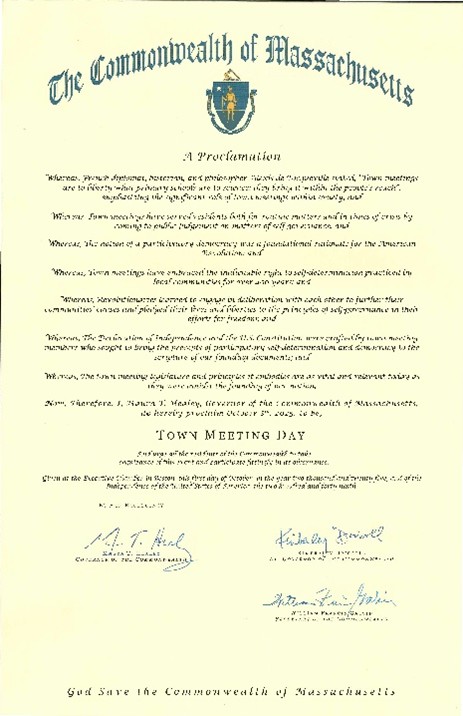 Under Massachusetts General Laws Chapter 6, Section 15PP, the governor must annually proclaim October 8 as Town Meeting Day to commemorate the first recorded town meeting, held in Dorchester on October 8, 1633.