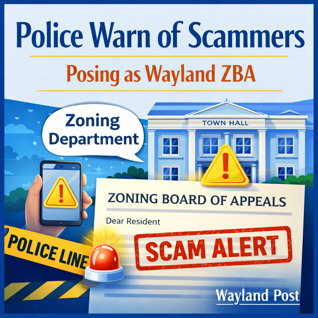 Police are alerting residents that the Wayland ZBA does not collect fees this way and to not send any money. A similar scam happened at the end of 2025 when the scammers claimed they were from the Wayland Planning Board.