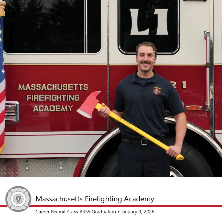 Firefighter and paramedic James Sykes graduated from the Recruit Training Program of the Massachusetts Firefighting Academy on Jan. 9. Sykes was part of Career Recruit Training Class 335, a class of 28 firefighters who graduated in Stow after 10 weeks of foundation training
