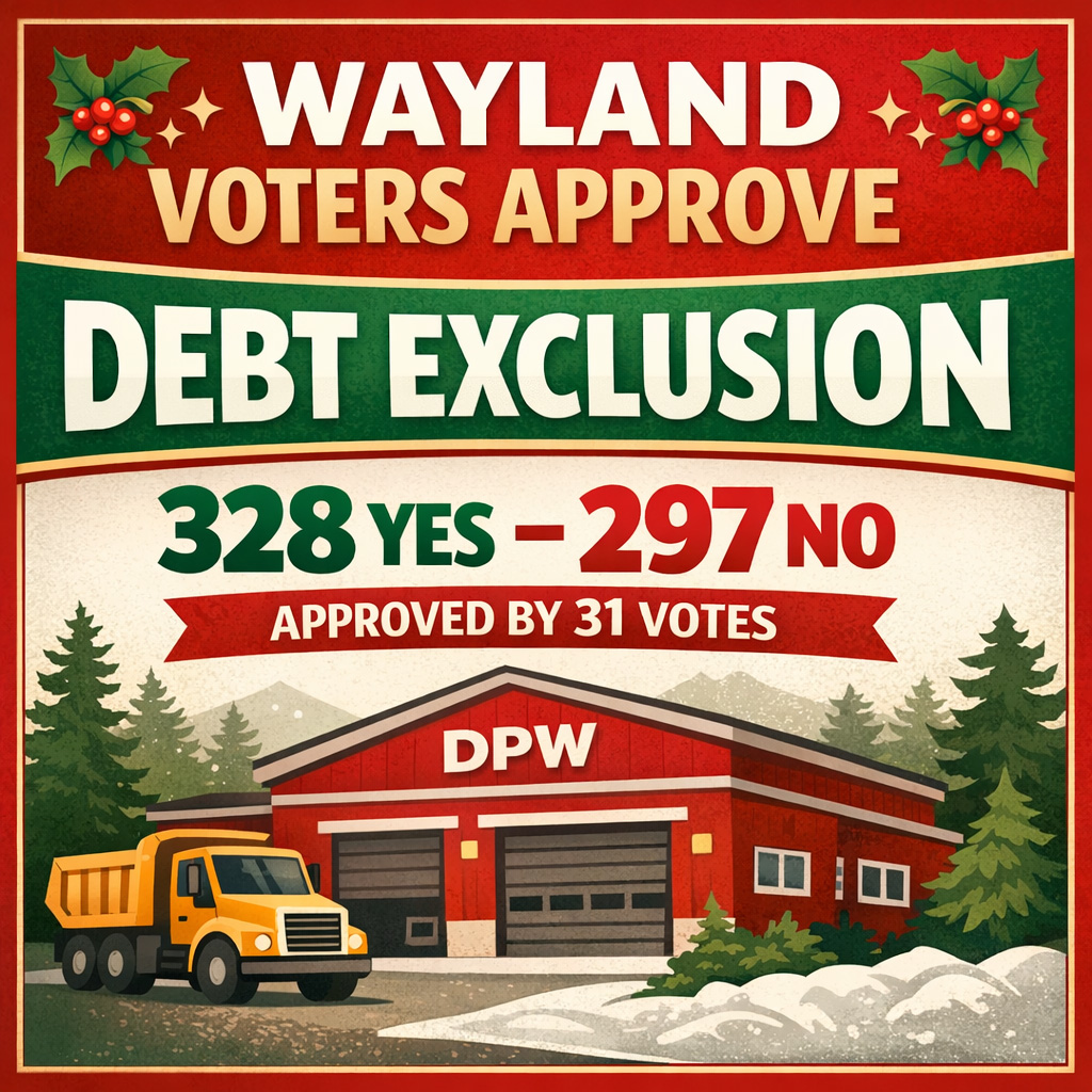 Wayland voters approved a single ballot question at a special town election, with unofficial results showing 328 votes in favor and 297 opposed, a margin of 31 votes. A total of 625 ballots were cast, representing about 6% of the town’s 10,715 registered voters.