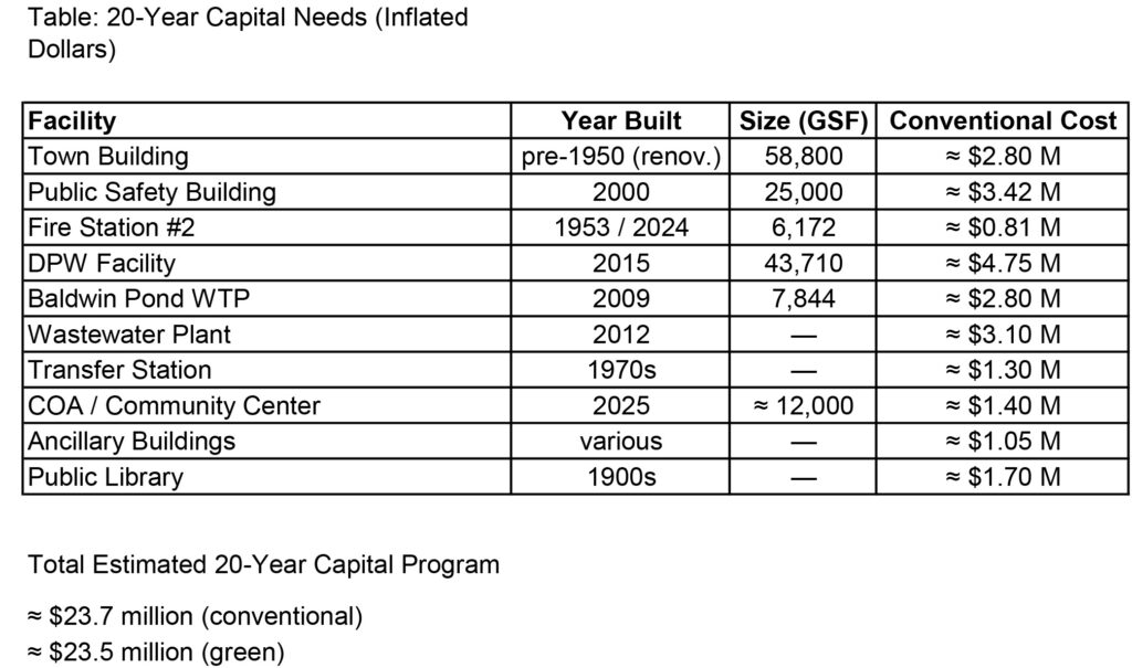 A comprehensive review of Wayland’s major public buildings projects to be nearly $23.5 million in capital expenses over the next two decades, according to the 2025 Green Capital Needs Assessment (GCNA) prepared by On-Site Insight/RECAP Real Estate Advisors. The study evaluated 10 town facilities, comparing conventional repairs with environmentally sustainable “green” options that improve efficiency, air quality, and durability.