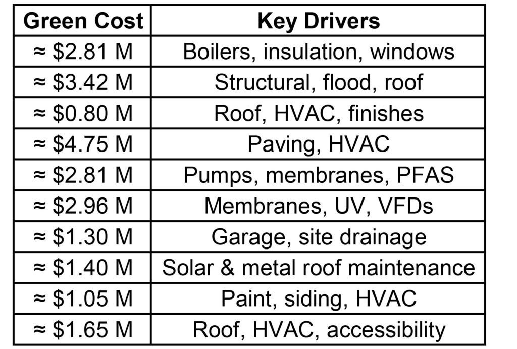 While green options increase upfront investment in some cases, they reduce overall costs by about $200,000, or roughly 1 percent, over the 20-year horizon, largely through energy savings and extended material life.