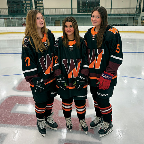 The three girls from Wayland on the Wayland/Weston/Newton South ice hockey team (from left) sophomore Mackenzie Young, freshman Adeline Marashio, and sophomore Drew Galizio. (Courtesy photo)