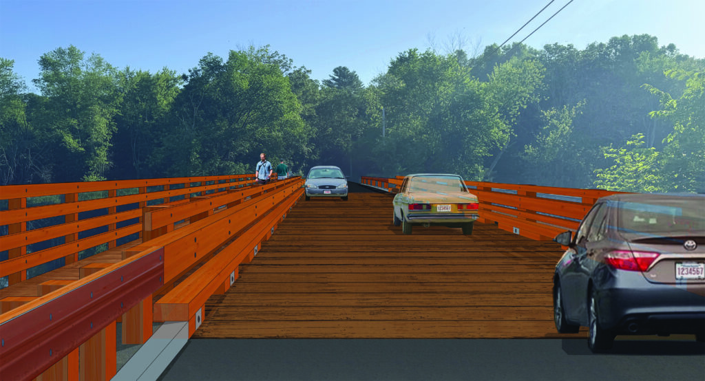 TEC, Inc. project engineer Michael Ricciardi outlined a conceptual plan to replace the bridge’s deteriorated timber decking with glulam timber planks (engineered laminated wood beams which are stronger than wood alone) covered by a waterproof asphalt surface. The plan also calls for crash-tested glulam timber railings and new steel approach guardrails painted in neutral colors to blend with the surrounding natural area.
