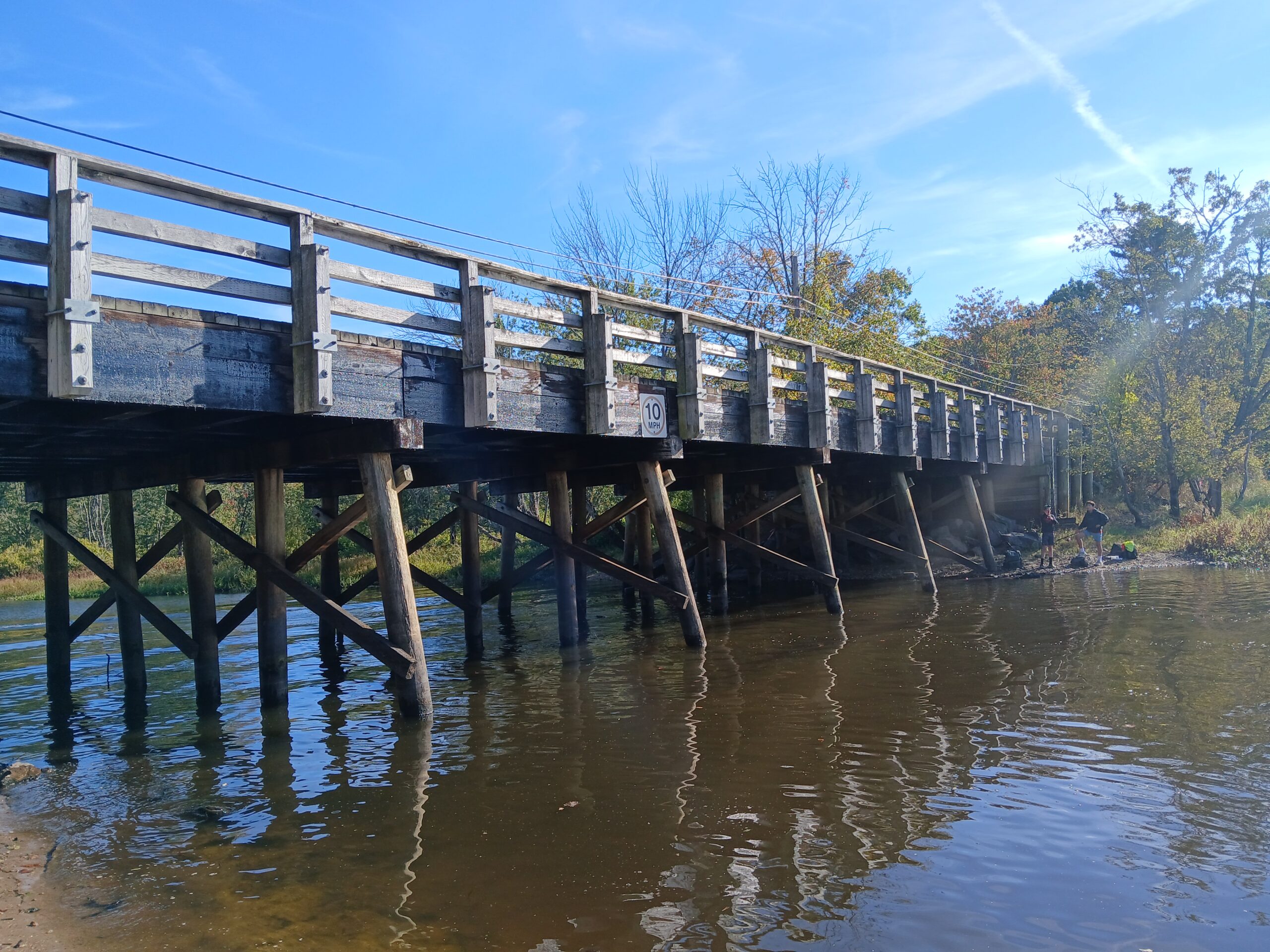 Jointly owned by both towns, the bridge was last rebuilt in 1992 but has required increasingly frequent repairs. Several issues now compromise the bridge’s safety: the deck’s many wooden plank boards can no longer be securely fastened by bolts to the stringers running underneath, some diagonal cross bracing has become loose, and one of the supporting piles has some underwater rotting. Each piling is rated for loads of 30 tons or more and a 50-year freshwater lifetime.
