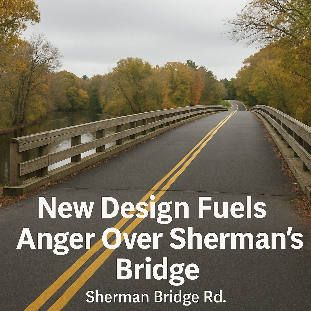 I am writing to express my anger at the new design of Sherman’s Bridge. My husband and I have lived at 15 Sherman Bridge Rd. for 48 years. When we bought this house the road was a narrow, winding , scenic road. We were part of the first fight to protect this historic bridge. They originally wanted it to be like the cement bridge on 117. After much negotiation, we accepted that they would make it wider and higher, but remain wooden. The original bridge could only have one car cross at a time and was frequently closed due to flooding. This bridge as it stands now was a concession. Unfortunately, this was a mistake. Suddenly Sherman Bridge Rd. became a cut through instead of Rt. 20 or 117. There was a 10 ton limit sign. What happened to that?